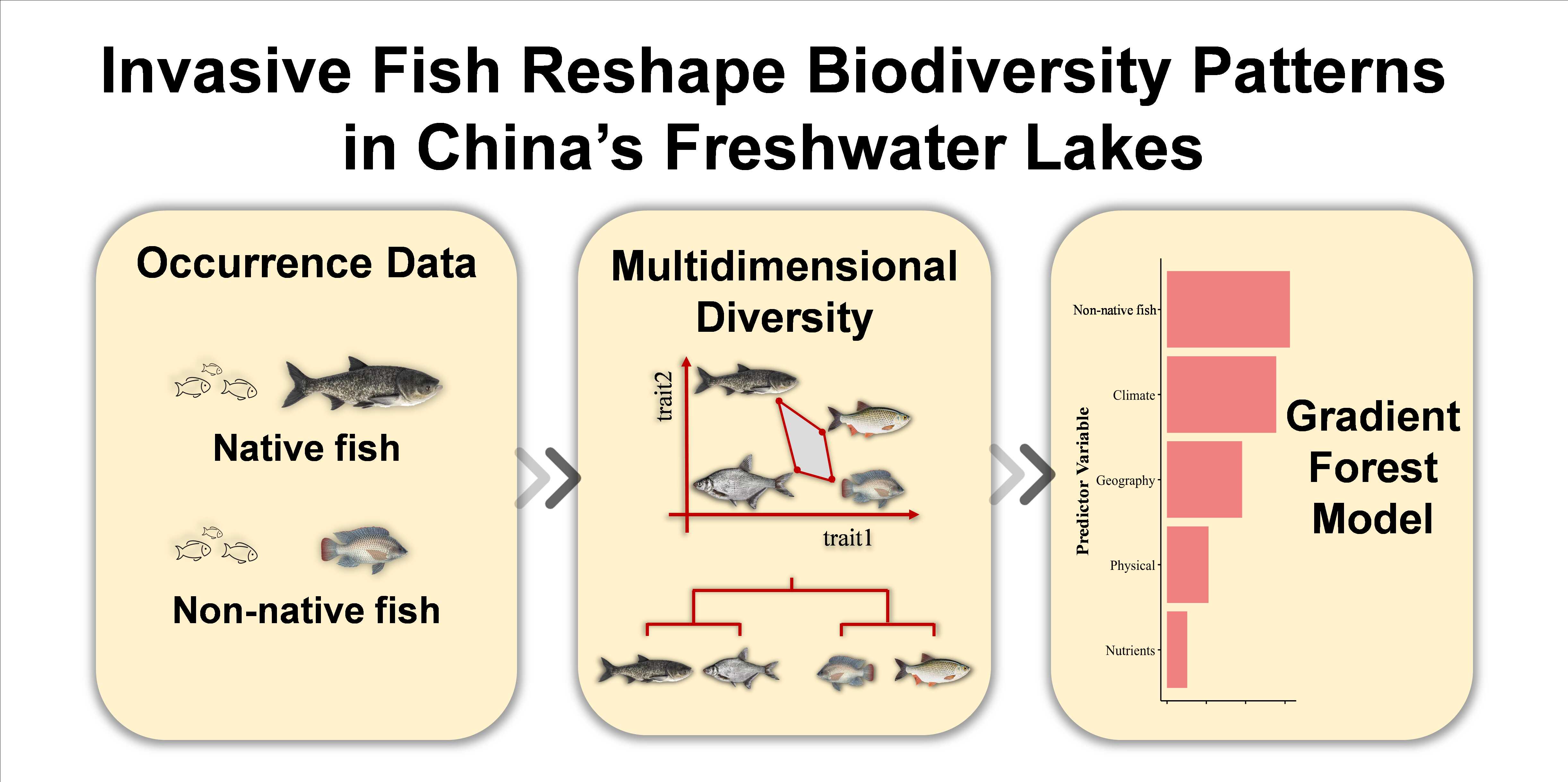 全球化进程加速了外来物种的扩散,对淡水生态系统构成了更严重的威胁。我国湖泊鱼类资源丰富,但长期以来,关于外来鱼类在生物多样性格局形成中的作用研究较为匮乏。现有研究多集中于物种多样性层面,缺乏从功能特征和系统发育维度召开的综合分析,这限制了对本地鱼类多样性丧失机制的深入认识,也影响了科学保护政策的制定。因此,亟需在全国范围和长时间尺度上,系统评估外来鱼类对我国湖泊鱼类多维多样性及生态系统功能的影响。