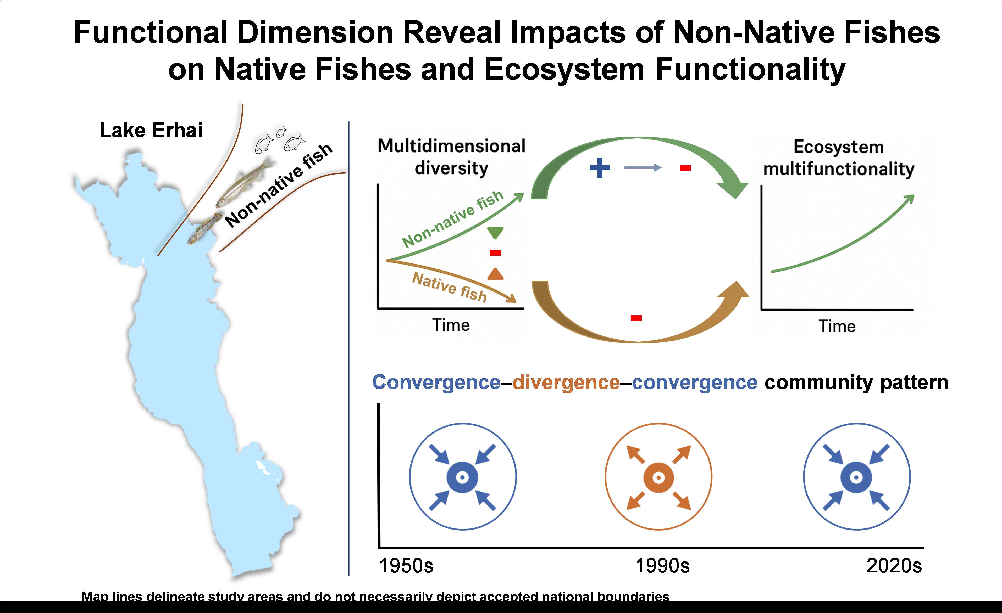 研究团队进一步以典型外来鱼类入侵热点湖泊洱海为例,召开了长时间序列的研究和分析。结果显示,外来鱼类多样性持续上升,本地鱼类多样性则显著下降。外来鱼类功能多样性在较低水平时与生态系统多功能性正相关,但在高水平时转为负相关;而本地鱼类功能多样性及水位、透明度、降水等环境因子则与生态系统多功能性呈负相关。同时,鱼类群落功能空间及其功能与系统发育格局表现出“收敛—发散—再收敛”的动态变化,反映出外来鱼类入侵对湖泊生态系统的长期深远影响(图2,Liang et al,2025b,http://doi.org/10.1111/gcb.70501)。